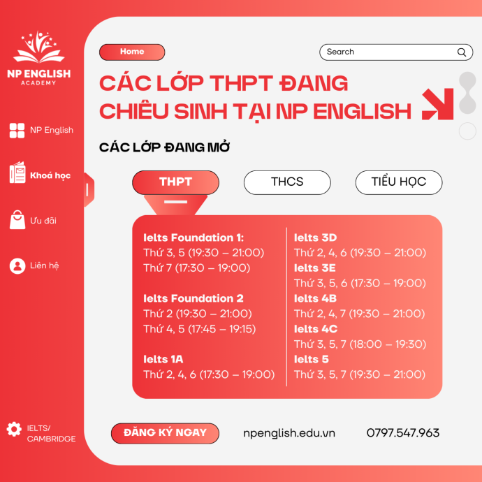 Từ lớp thiếu nhi đến các bạn ôn thi THCS, THPT, Cambridge và IELTS chuyên sâu, NP English mang đến lộ trình học hiệu quả, giáo viên tận tâm và môi trường học thân thiện, giúp bạn tự tin bứt phá trong học tập.