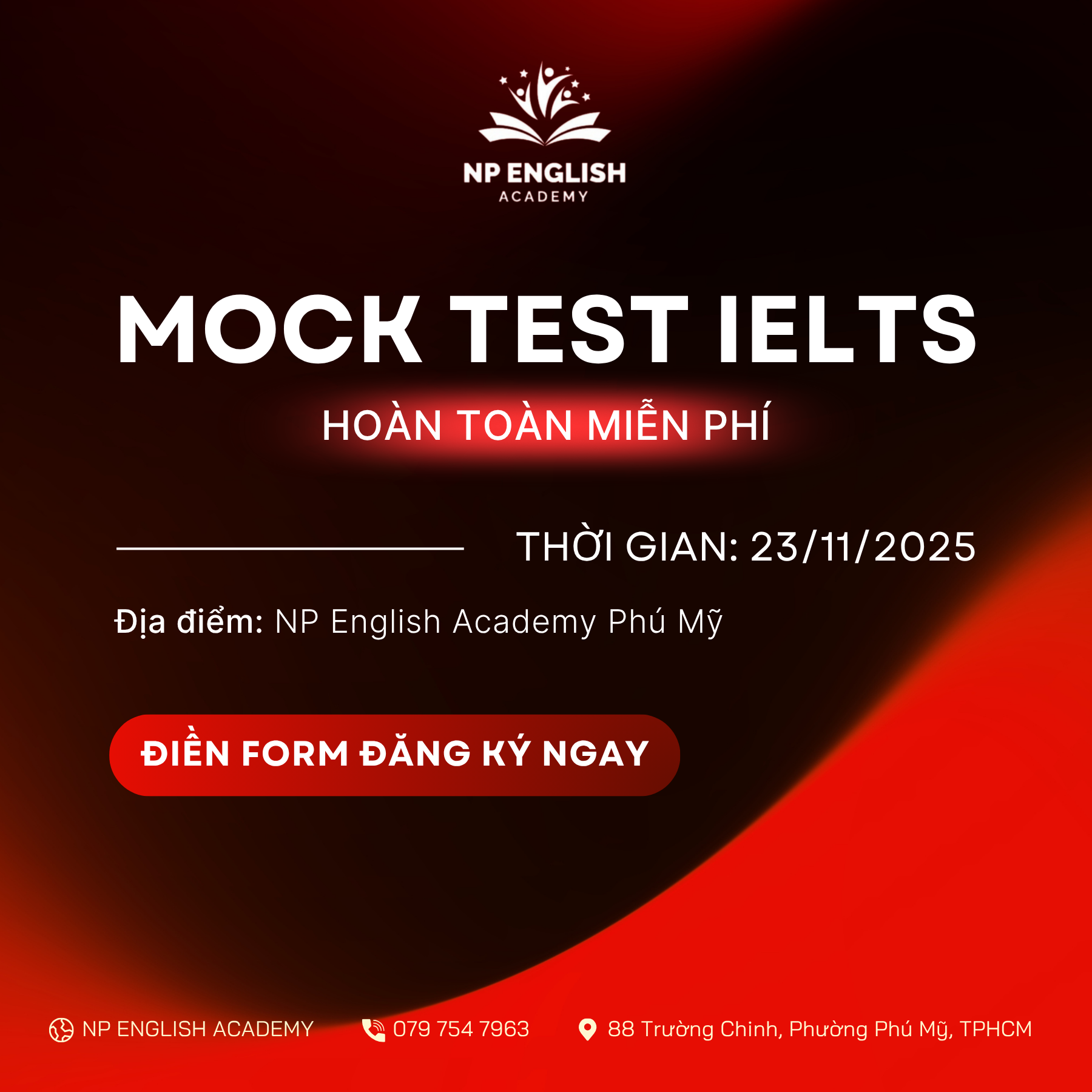 Để giúp các bạn chuẩn bị tốt nhất cho kỳ thi IELTS quan trọng, NP English tổ chức chương trình Mock Test IELTS. Kỳ thi thử này sẽ giúp bạn kiểm tra trình độ, làm quen áp lực thời gian và đánh giá chính xác band hiện tại.